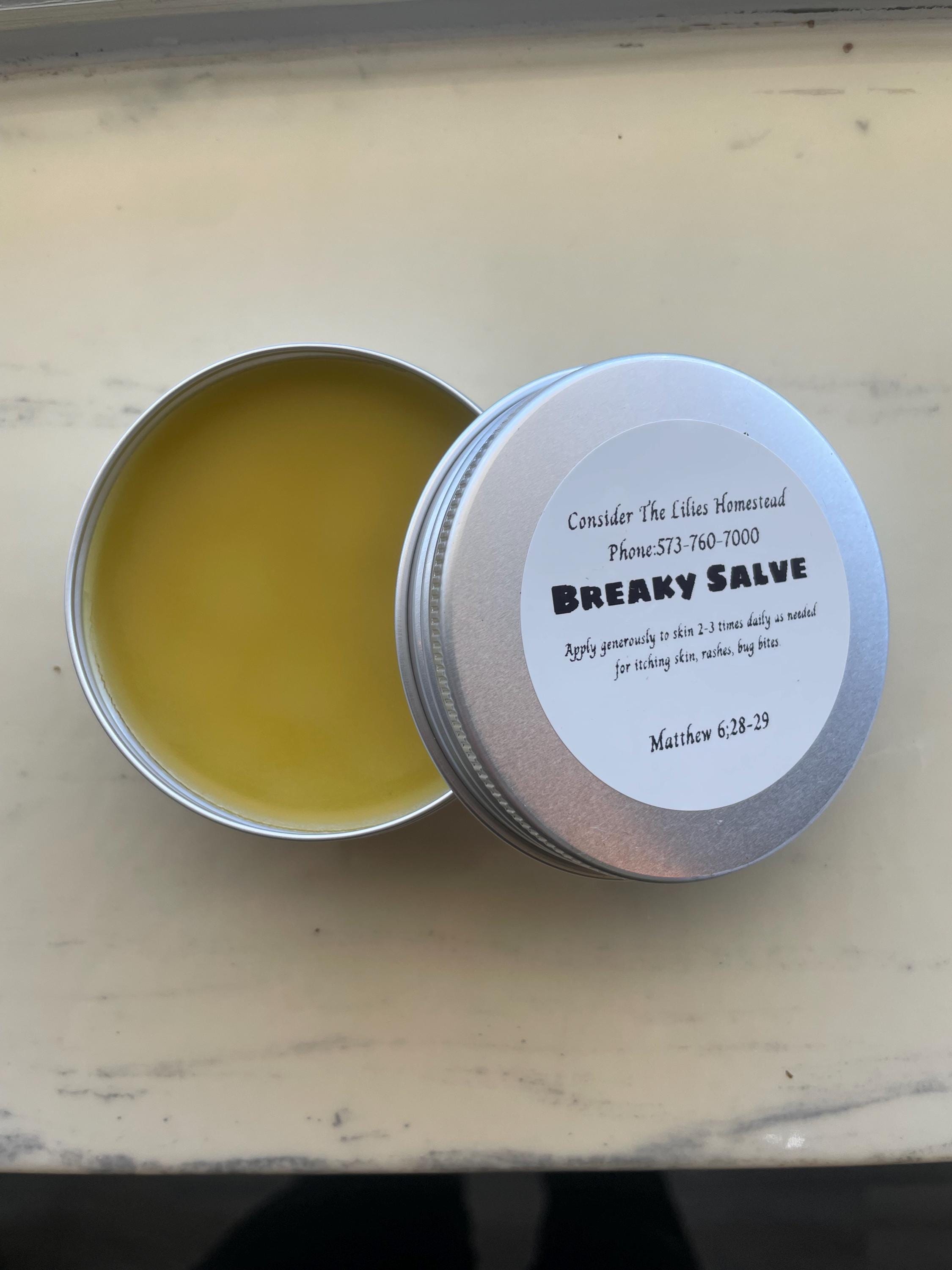 This is an all natural salve made on my Homestead It is infused with organic herbs, including calendula, which is great for the skin. It can be used on any type of itchy skin, such as poison ivy, eczema, or psoriasis. Will clear up rashes quickly. This is a 2 ounce tin.